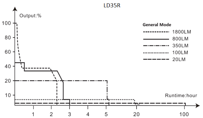 - Eco: 20 Lumens, 101.9 hours, 112 feet